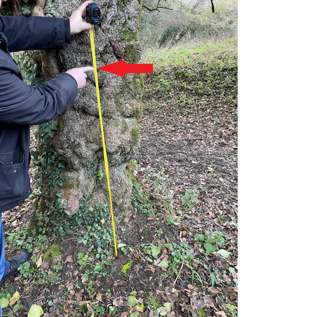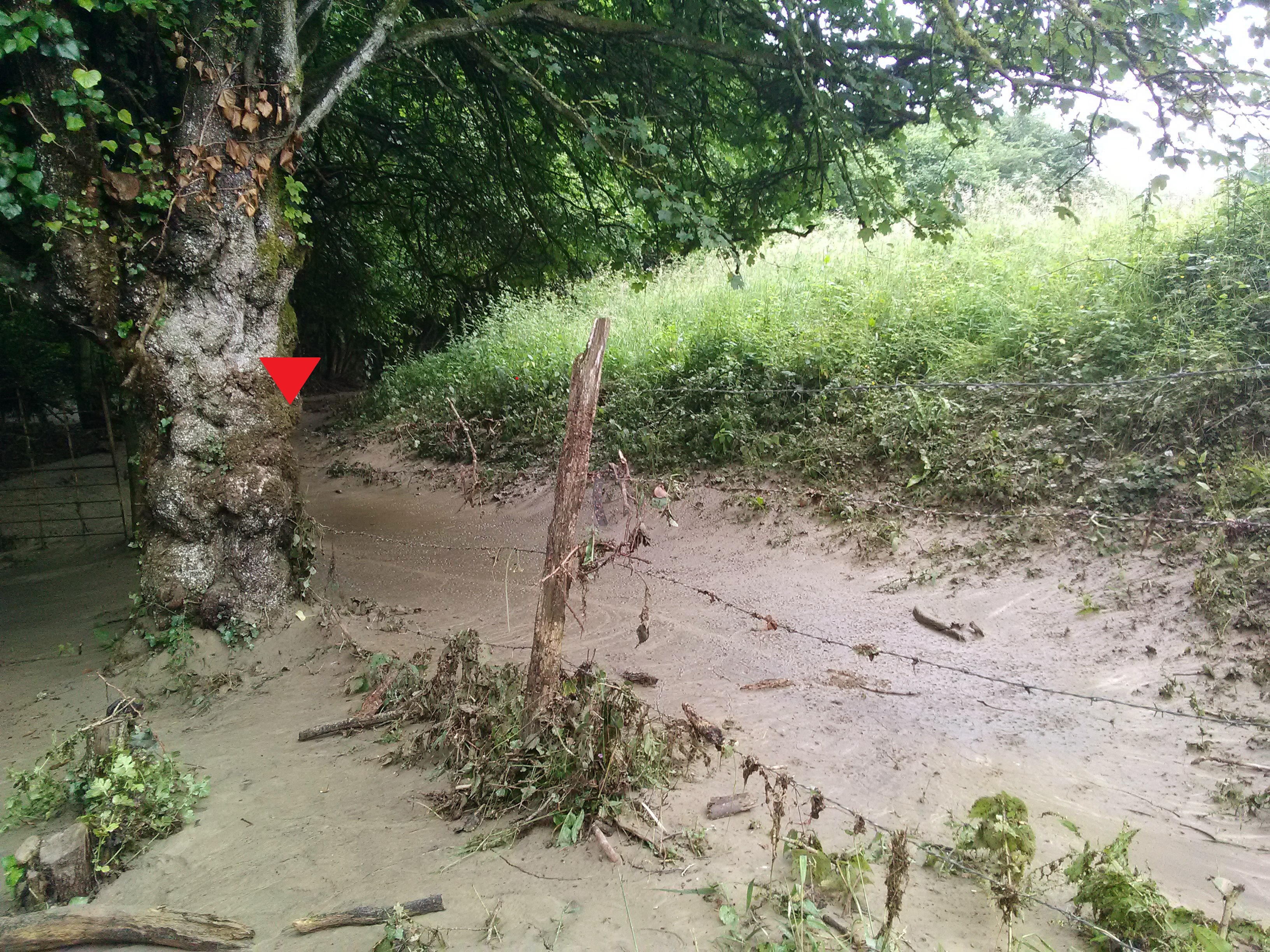 - Commentaires : Niveau de crue estimé sur le tronc de l’érable champêtre au matin après l’évènement lors de la visite de terrain du SMBVT.