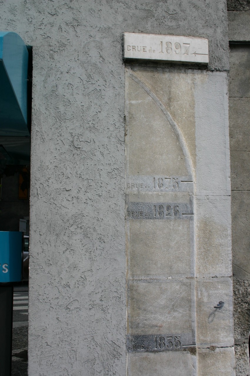 - Commentaires : On trouve 4 repères gravés pour les crues de 1926 (cote 500 - 26 m) - de 1835 (cote 500 - 06 m) - du 23 juin 1875 (cote 500 - 69 m) - du 3 juillet 1897 (cote 501 - 22 m) et du 8 novembre 1982 (cote 499 - 26 m).