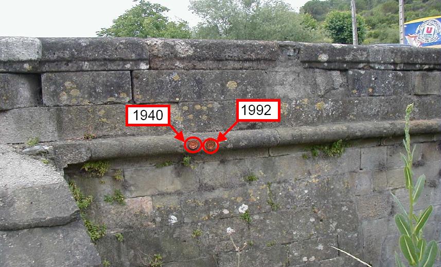 - Commentaires : Culée droite aval rive gauche. repères de crue ancrés même hauteur sur la plinthe du pont . Date d'enquete : 02/05/2002