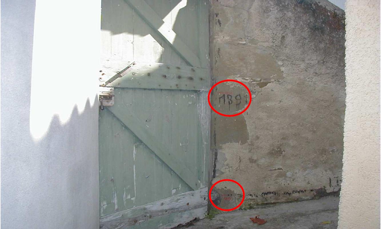 - Commentaires : Piédroit portail rive droite. trait rouge et inscription sur le mur . Date d'enquete : 24/11/1999