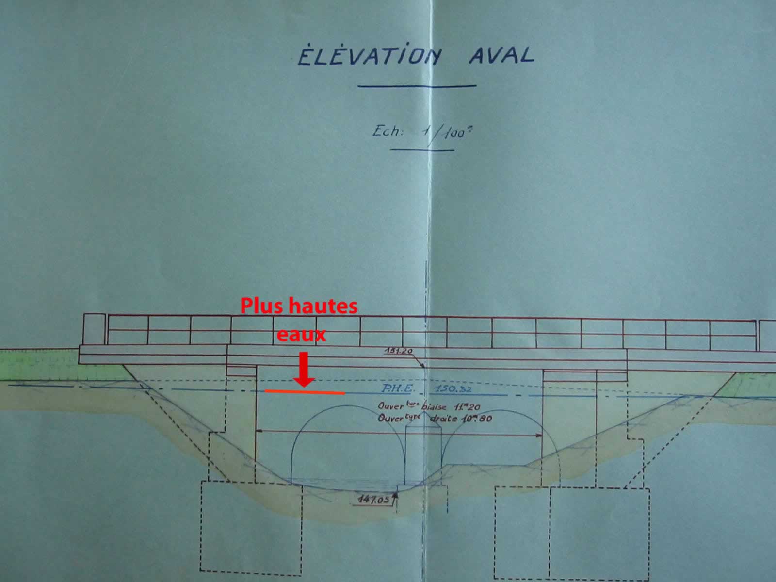 - Commentaires : Reconstruction du pont Ste Marie (RD 228). Plan de 1958 La ligne des PHE est à 150,32 m NGF, soit environ 150,50 m aujourd’hui. Le riverain a vu l’eau arriver au niveau du tablier soit 151,50 m environ..