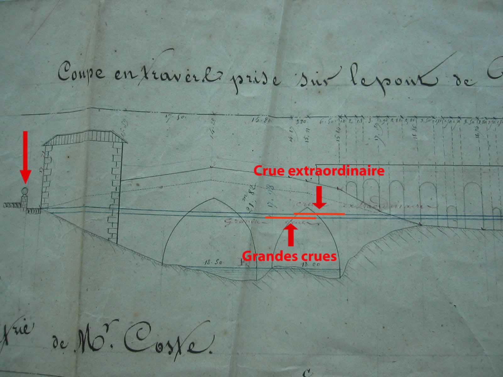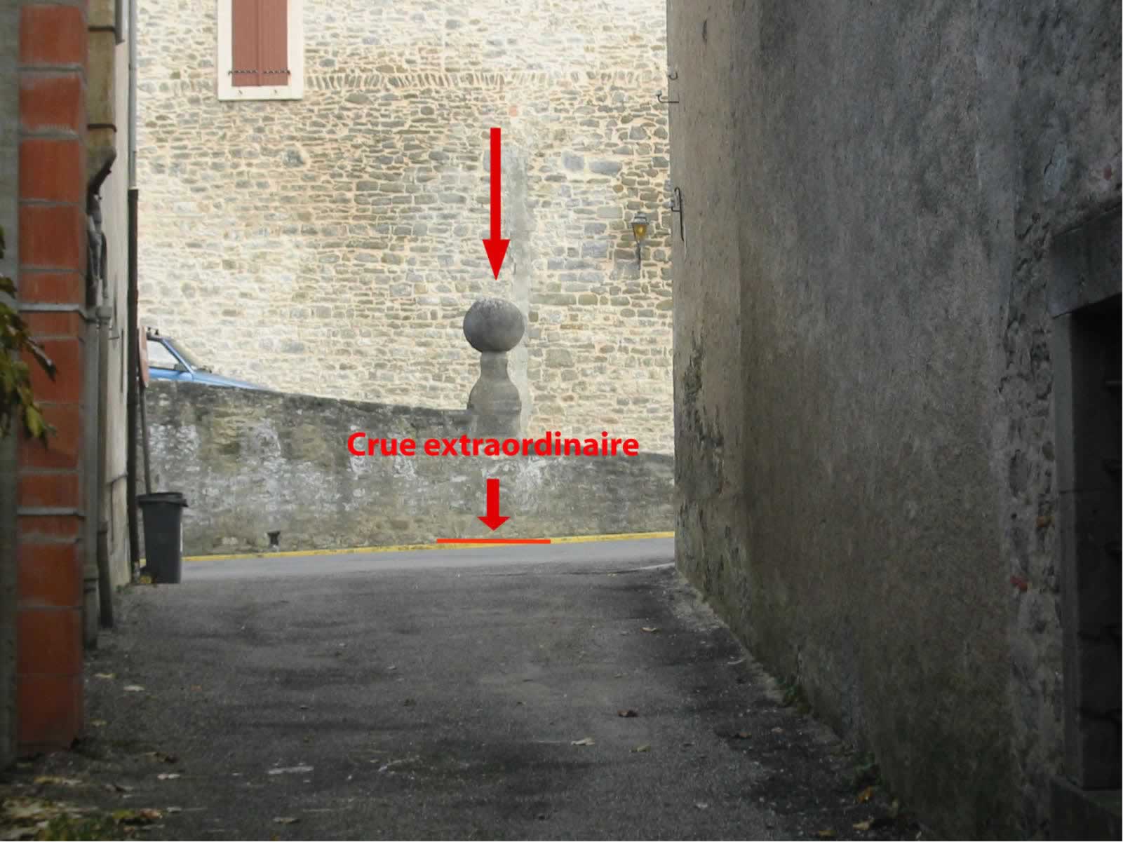 - Commentaires : Ruelle à proximité du pont de la RD 203, rive gauche. Sur le document de juillet 1846, l’eau de la crue extraordinaire arrive au TN sous la "quille" en pierre. L’observation terrain, ainsi que les témoignages d’"anciens" confirment ce fait.. Date d’enquête : 01/07/1846
