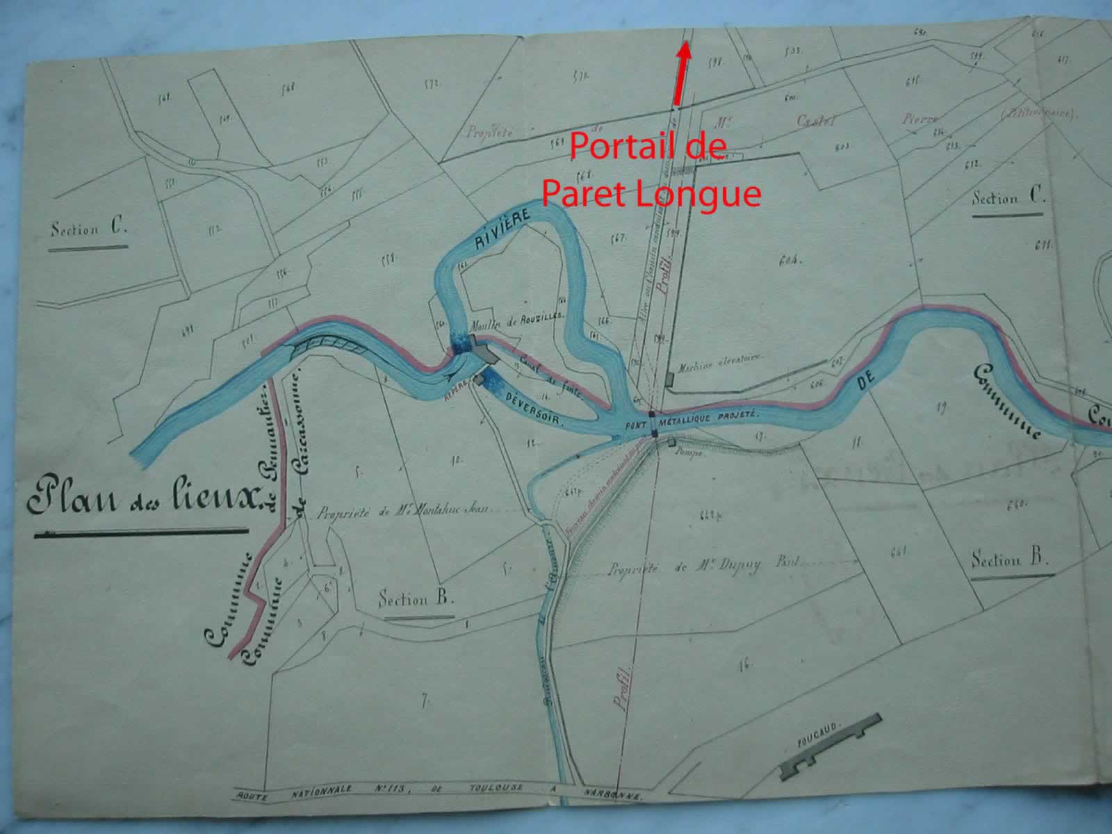 - Commentaires : Mur et portail entrée Paret Longue. Document du 18 avril 1891 avec indications des hautes eaux (100,02m de l’époque). Date d'enquete : 18/04/1891