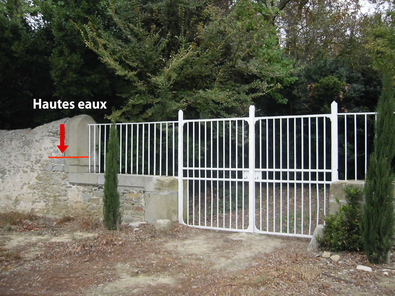 - Commentaires : Mur et portail entrée Paret Longue. Dire du régisseur du domaine : "0,70 m semble le maximum atteint en 2004". Date d’enquête : 22/11/2004
