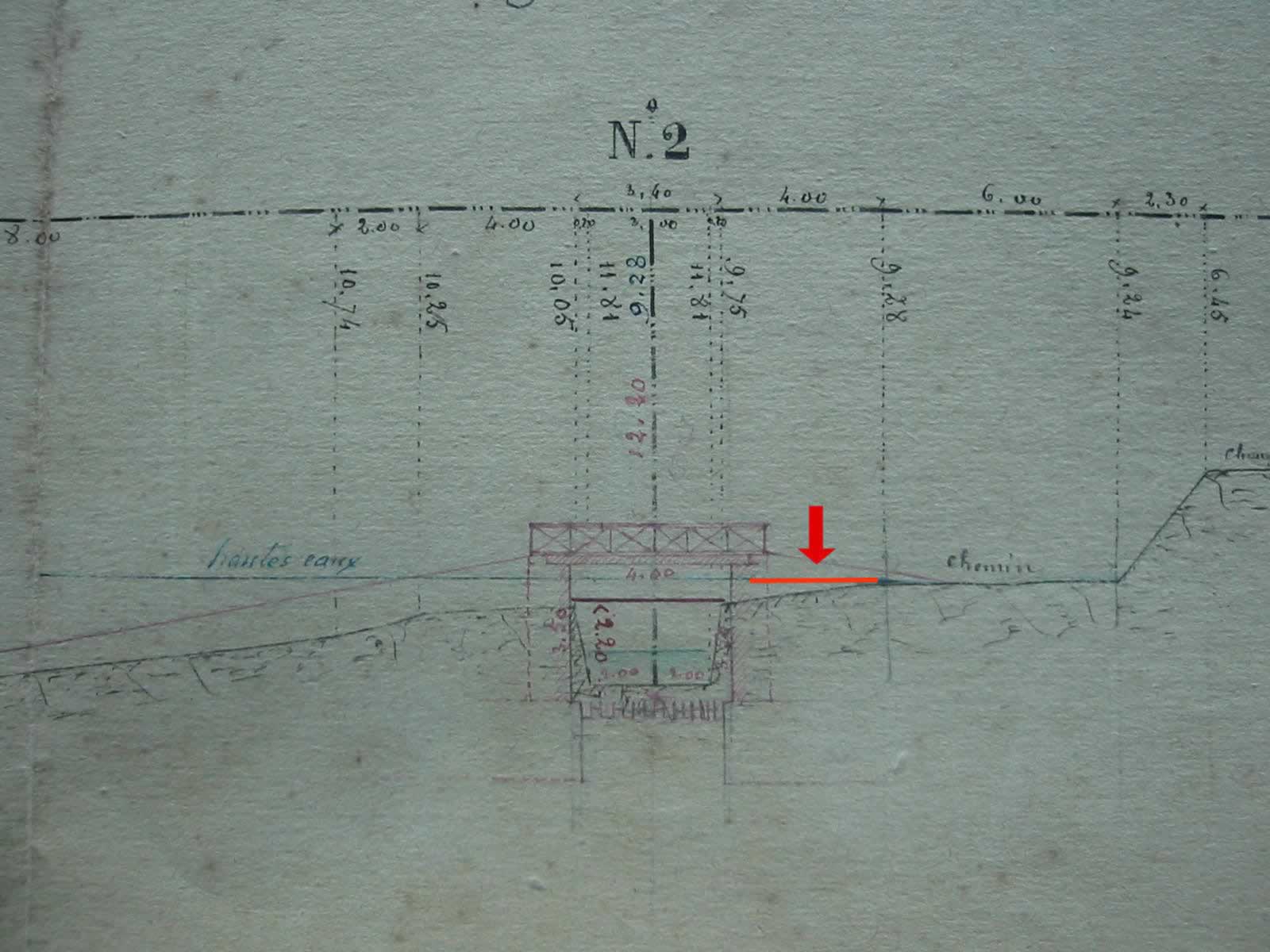 - Commentaires : Plan de construction d’une passerelle au barrage de Cadalenc. La ligne de Hautes Eaux affleure le chemin d’accès à Cadalenc.. Date d'enquete : 31/07/1876