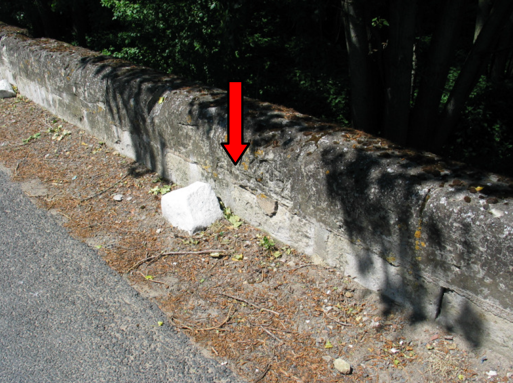 • Commentaires :  Gravure sur pierre du parapet aval, limite au sol de 1983