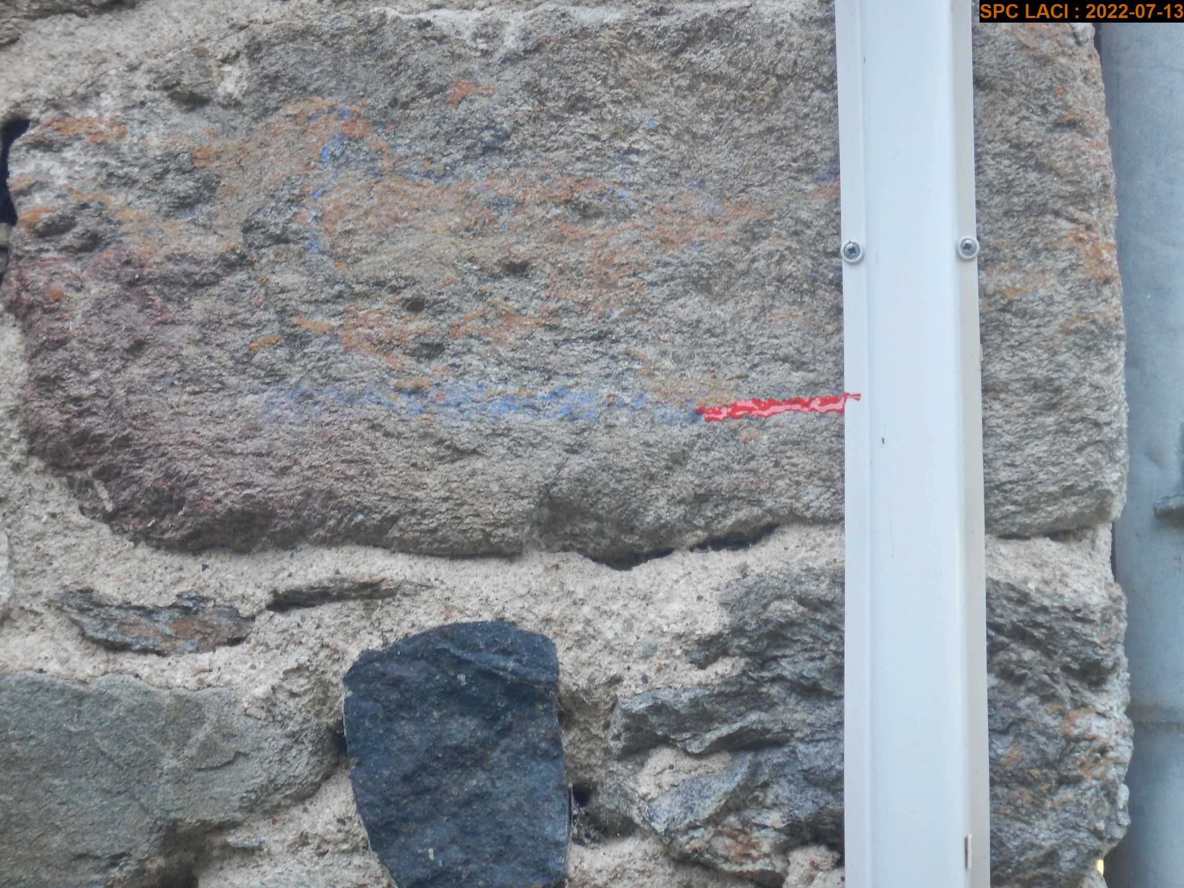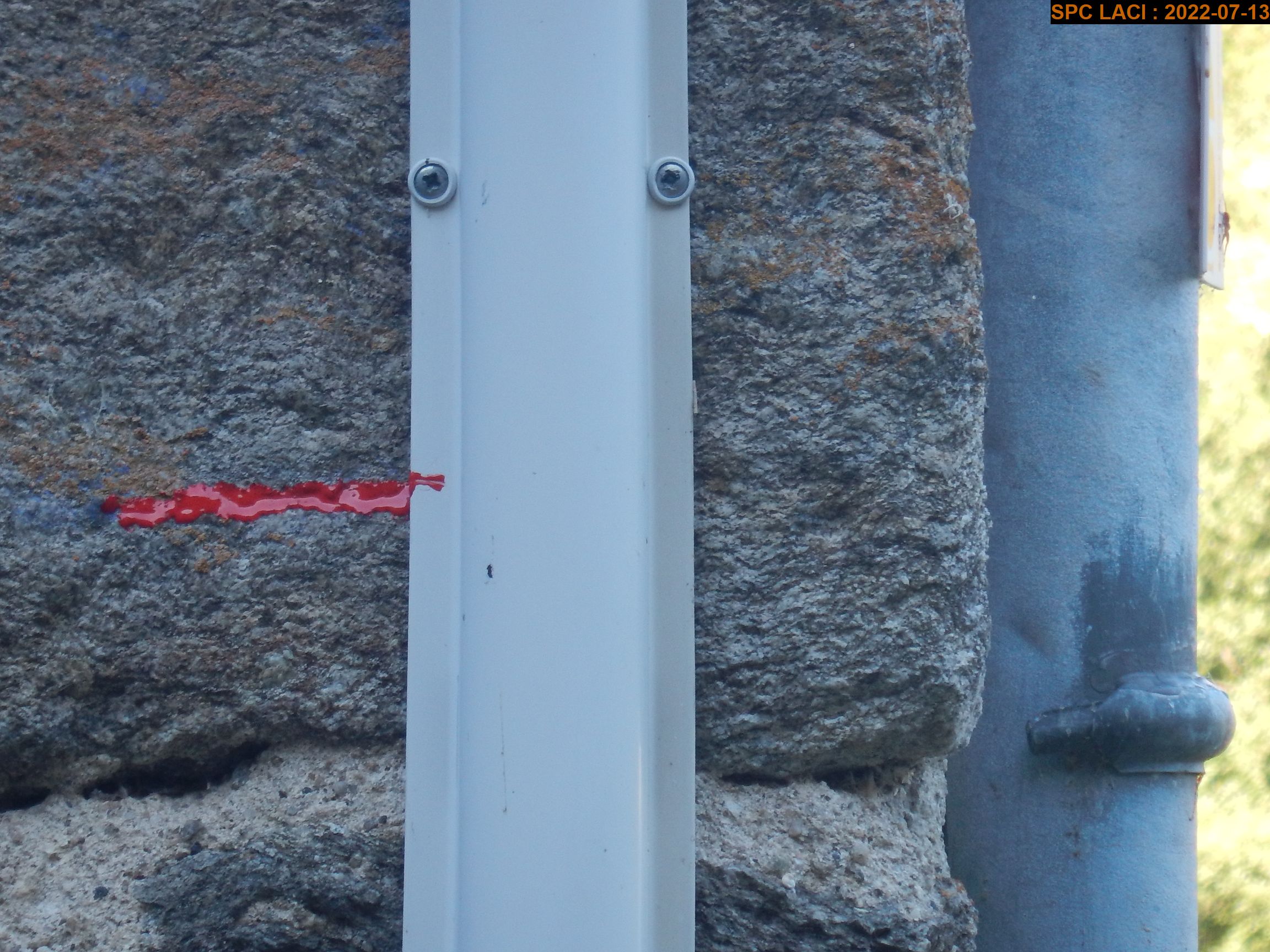 - Commentaires : Ce repère est une marque peinte en bleue situé sur le mur coté chemin à 1.63m du sol. Il se trouve proche du coin du mur et d'une gaine électrique et sa protection PVC blanche. Ce repère a été rénové par nouveau trait rouge.
