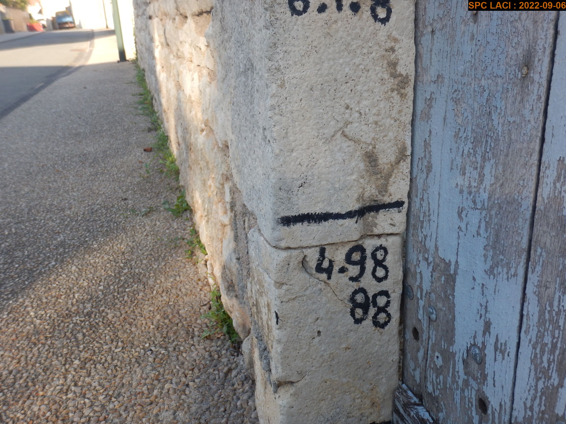 - Commentaires : Ce repère de crue est une marque de peinture noire avec un trait et un écrit. Elle se trouve sur le montant en pierre de l'accès au jardin à 0.44 m du bas du trottoir.