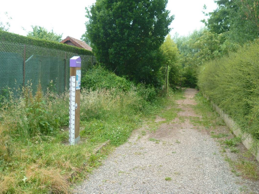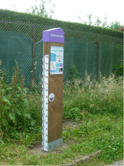 Macaron normalisé posé sur totem à 86 cm/sol avec panneau d’information et règle limnimétrique latérale